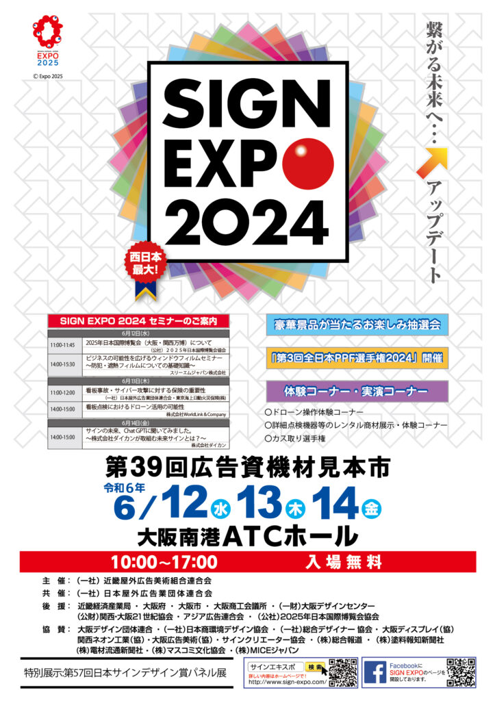 งานแสดงสินค้า SIGN EXPO 2024 ครั้งที่ 6 (งานแสดงสินค้าอุปกรณ์และวัสดุโฆษณา ครั้งที่ 12) จะจัดขึ้นเป็นเวลา 14 วันตั้งแต่วันพุธที่ 3 มิถุนายน ถึงวันศุกร์ที่ 39 มิถุนายน 2024 ที่ Osaka Nanko ATC Hall