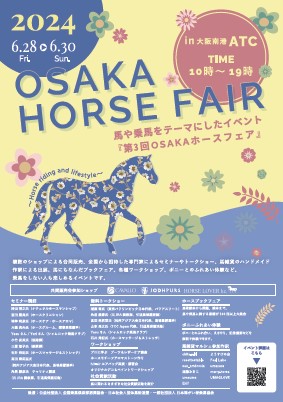 第三屆大阪馬展是一項以馬術和騎馬為主題的活動,將於 3 年 2024 月 6 日星期五至 28 月 6 日星期日在大阪南港 ATC 舉行。 屆時將有多家商店聯合銷售、邀請全國各地專家舉辦研討會和脫口秀、以及手工馬具藝術家的展覽。 也將舉辦與馬相關的書展、各種研討會以及與小馬互動的機會。 本次活動充滿了騎馬的樂趣,騎馬者和非騎馬者都可以享受。